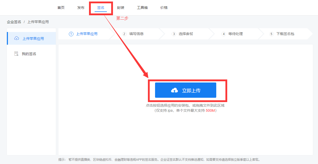 第二步、点击导航栏—签名,将第一步操作中下载的封装包,进行上传;