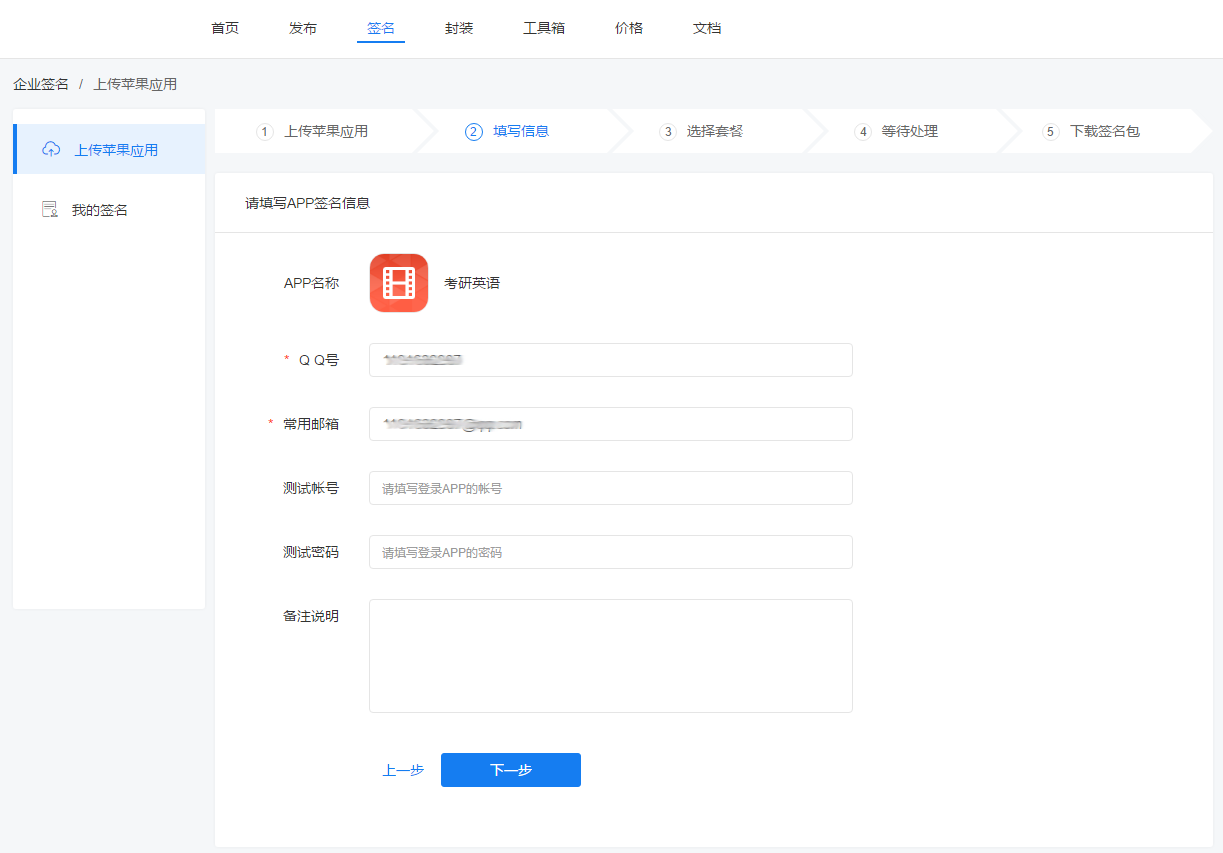 ① 填写信息,然后点击下一步;如果APP有测试账号和密码,请尽量填写,方便测试签名APP是否正常。