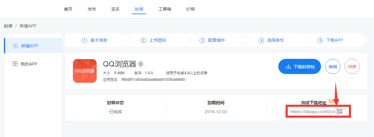 在【封装-APP详情页】如下图所示:点击测试下载链接,进行测试安装。